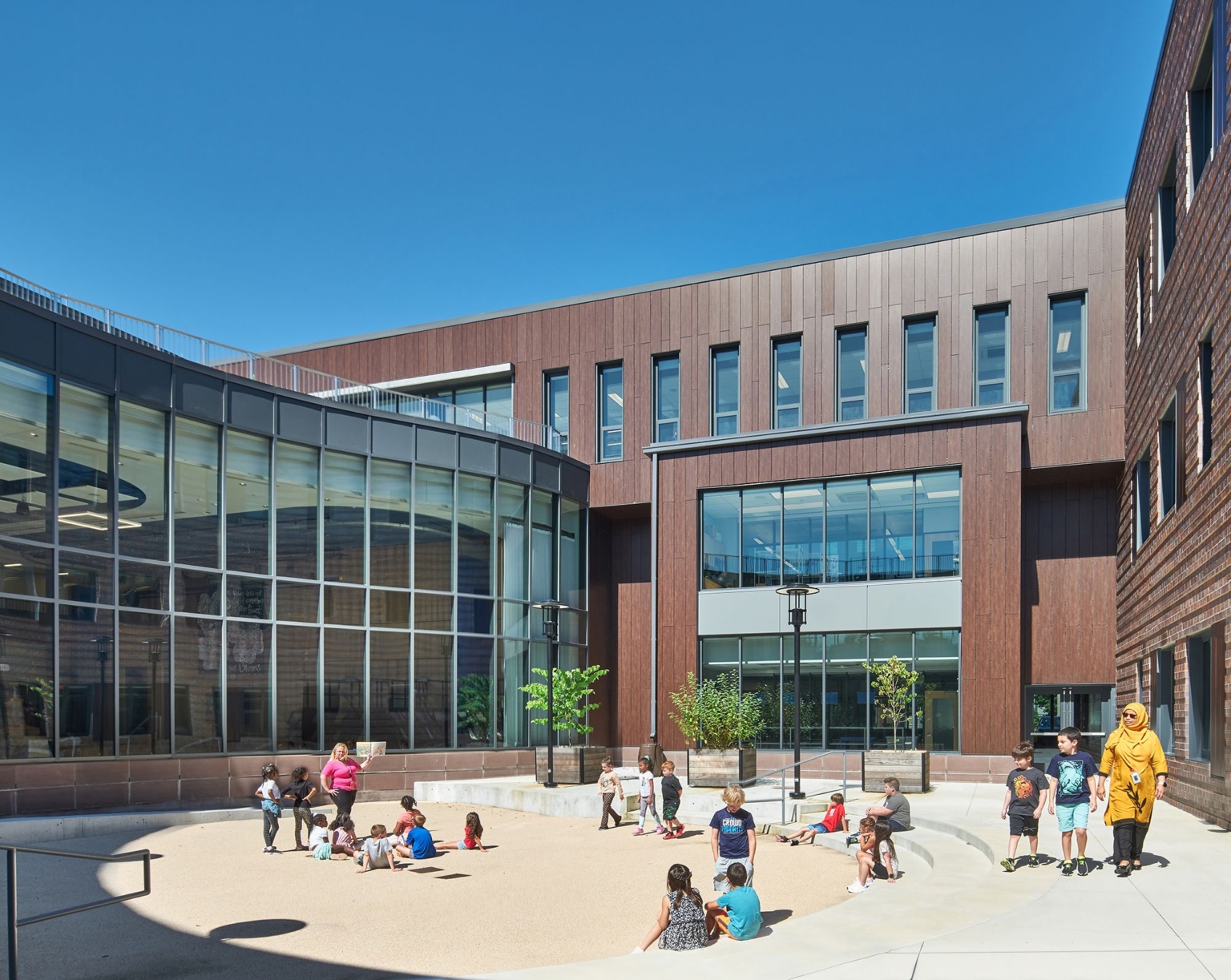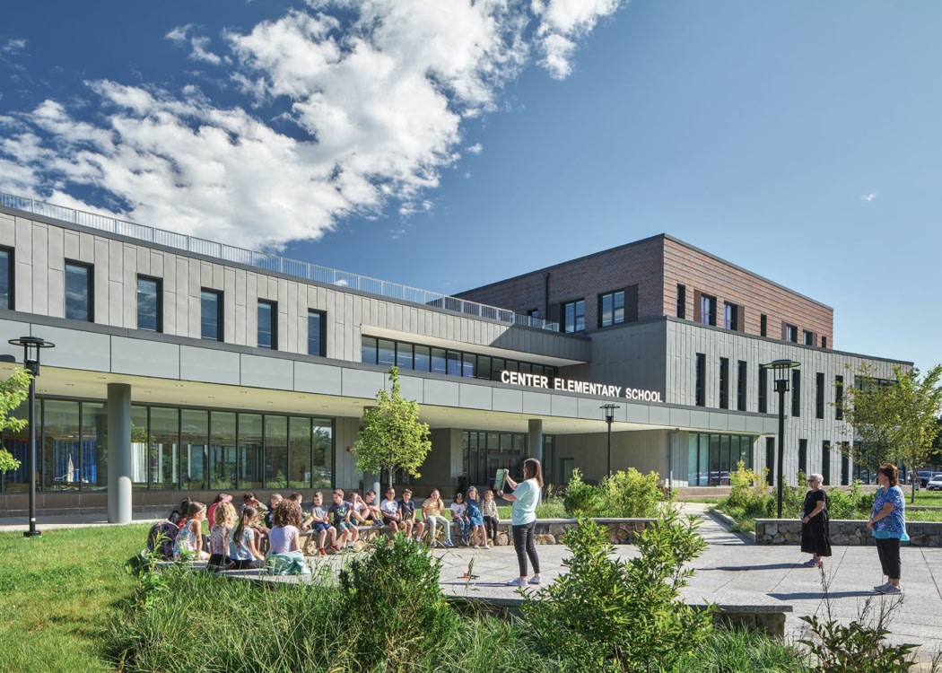 Designed by Flansburgh Architects, the new Center Elementary School in Tewksbury emphasizes connection—both within the learning environment and with the broader community. Featuring a distinctive curved entrance, outdoor classrooms, and a shared plaza, the design fosters collaboration and engagement.