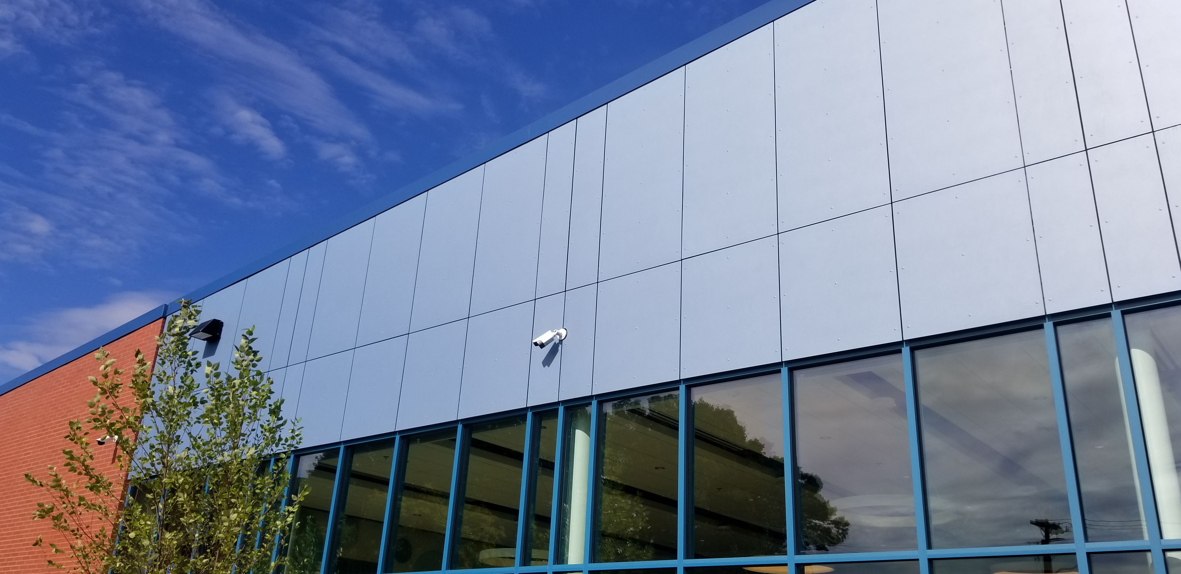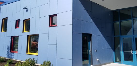 The school was reclad utilizing Swisspearl high-density fiber cement in Reflex Cobalt Blue.